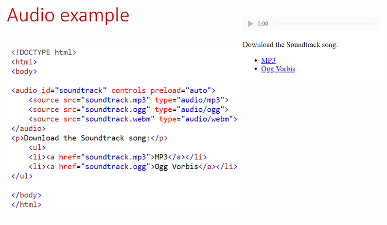 audio 요소는 video 와 비슷한 요소와 속성을 사용하지만, 화면에 표시할 것이 없기에 width, heigth, poster 속성은 사용하지 않는다
