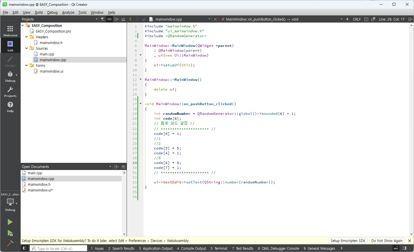 이제 난수를 만들어야 하는데, c++은 그냥 rand함수를 대충 넣으면 되지만, QT는 다른 함수를 사용해야 한다