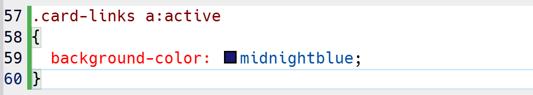 Add a new selector that targets the .card-links a elements when they are active. Set the background-color to midnightblue.