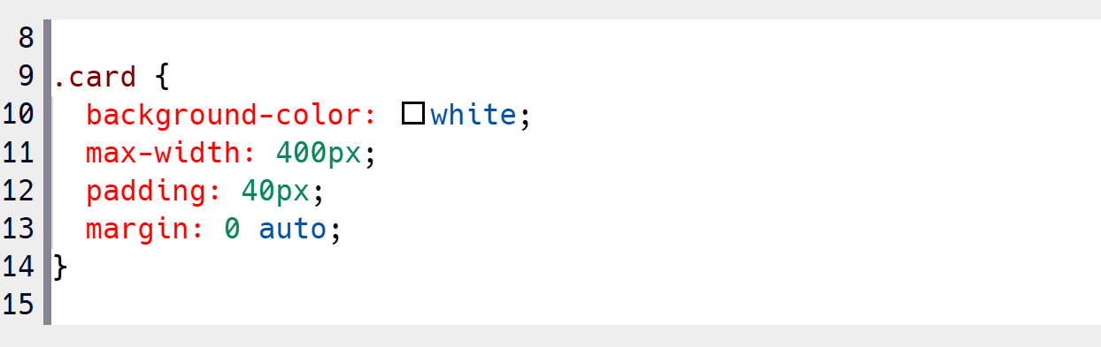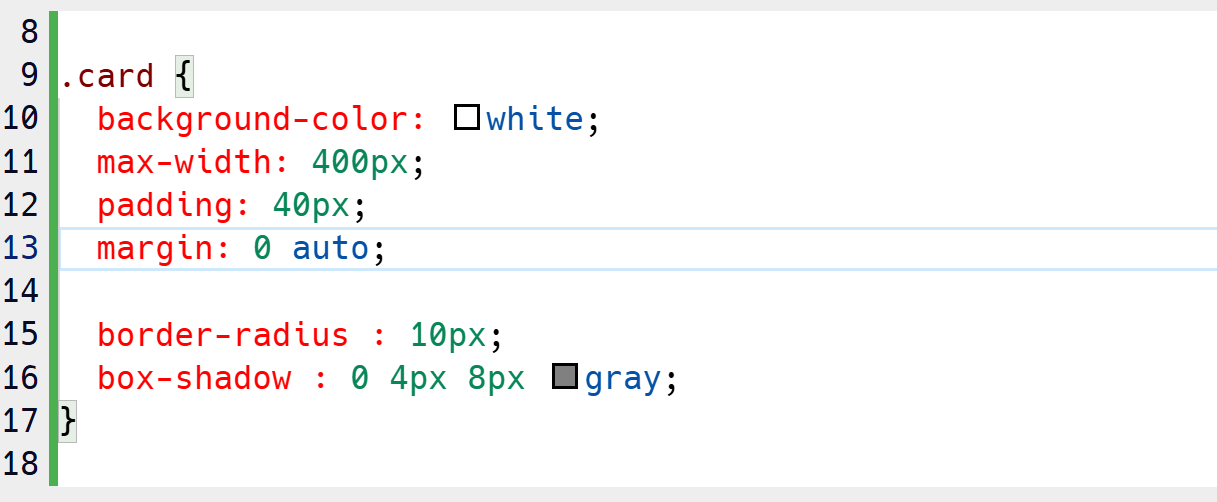 The .card element needs some more styling: add a border-radius of 10px, and a box-shadow with a value of 0 4px 8px gray.