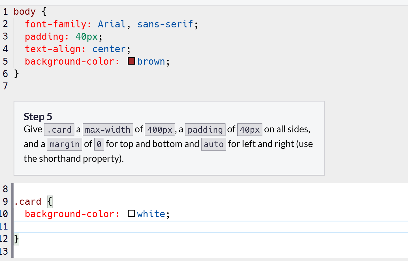 Now it's time for some color. Give the body a background-color of brown and also give the .card a background-color of white.