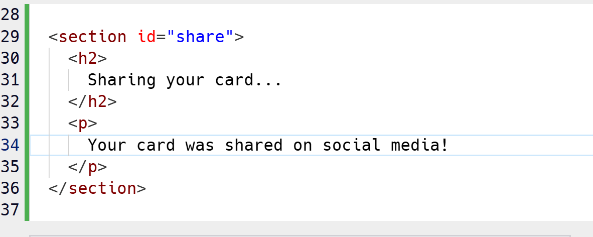 Add an h2 element to the #share element that contains the text Sharing your card..., then add a p element with the text Your card was shared on social media!.