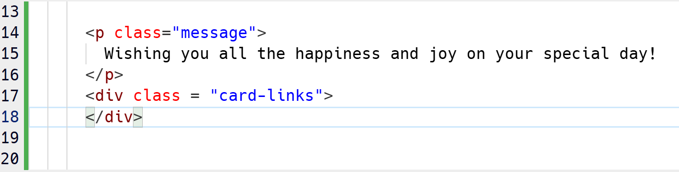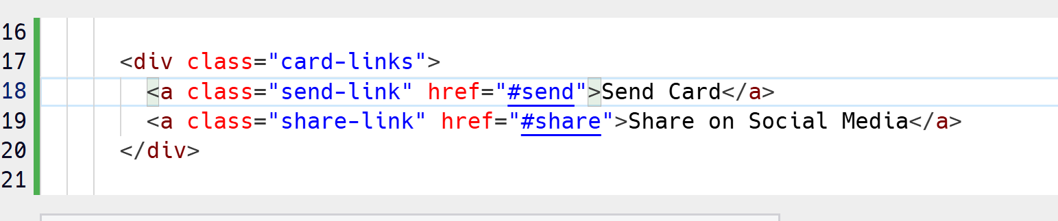 Now add a new div below the .message element. The new div should have a class attribute of card-links.