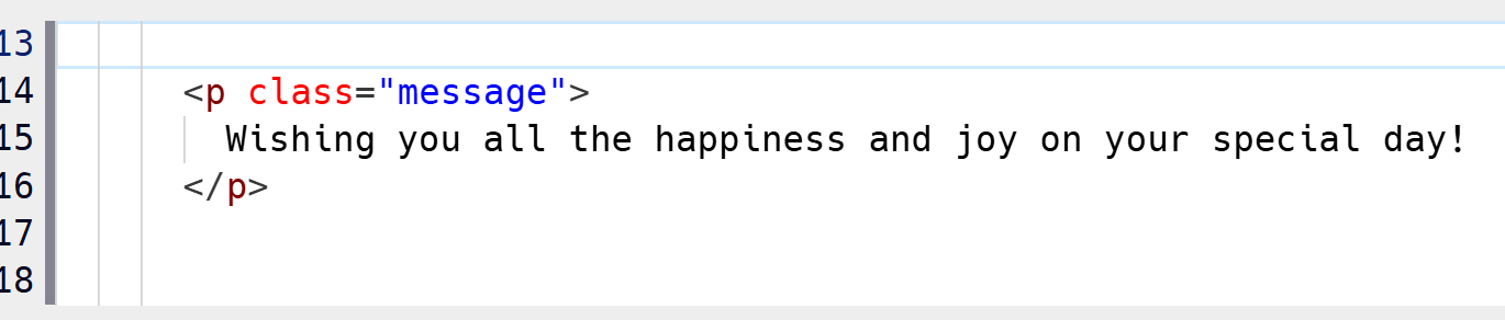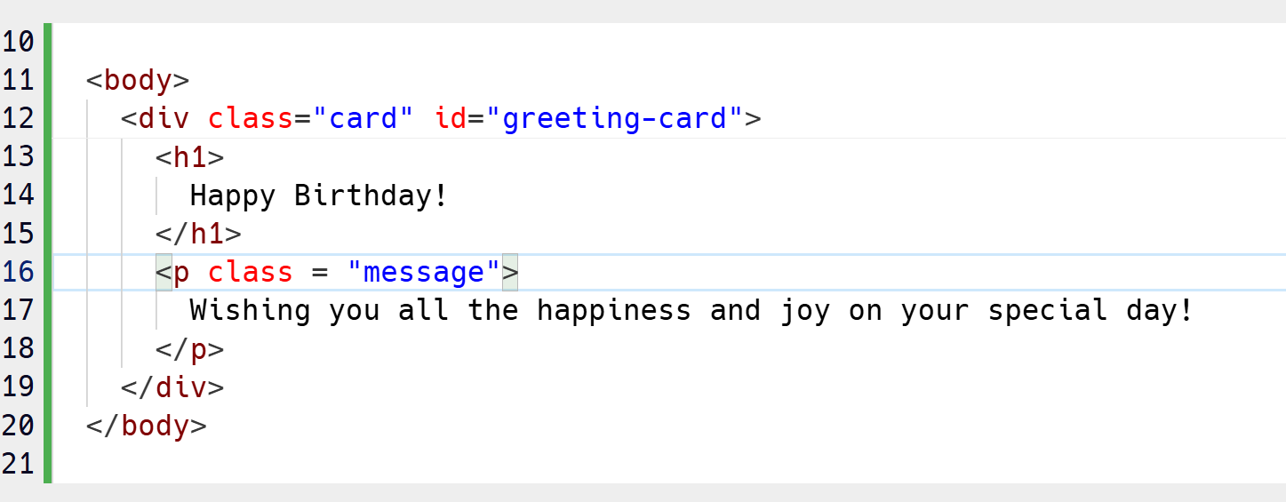 Inside the div element, add an h1 with the text Happy Birthday!. Then add a paragraph element with a class called message and the text Wishing you all the happiness and joy on your special day!.