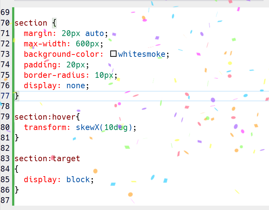 Add a selector that targets the section elements when hovered. Set the transform property to skewX(10deg).