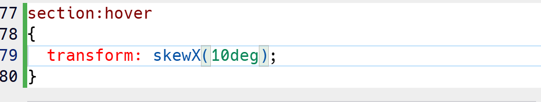 Another value that can be used for the transform property is skewX, this function skews the element horizontally.