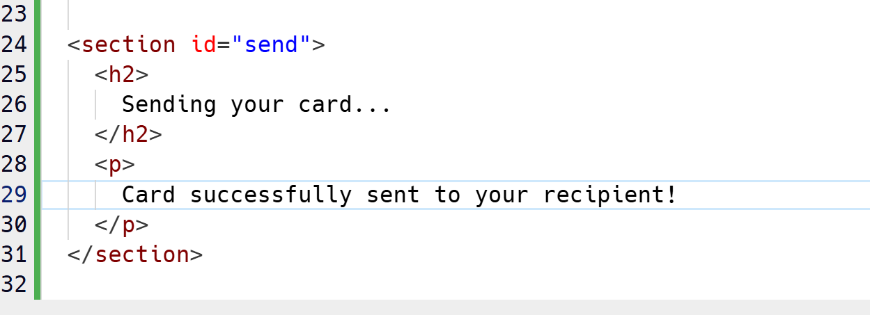 Add an h2 to #send that contains the text Sending your card..., then add a p element with the text Card successfully sent to your recipient!.
