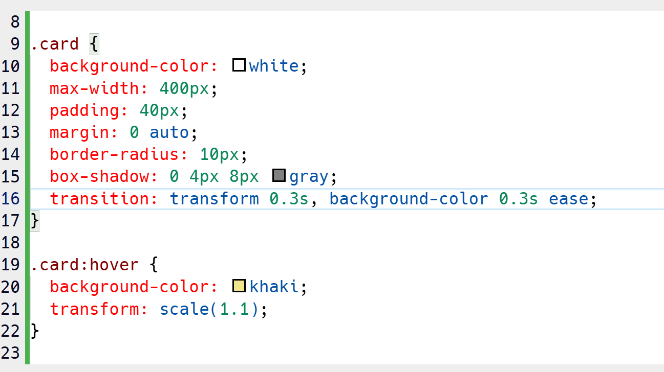 Add to the .card selector transition: transform 0.3s, background-color 0.3s ease.
