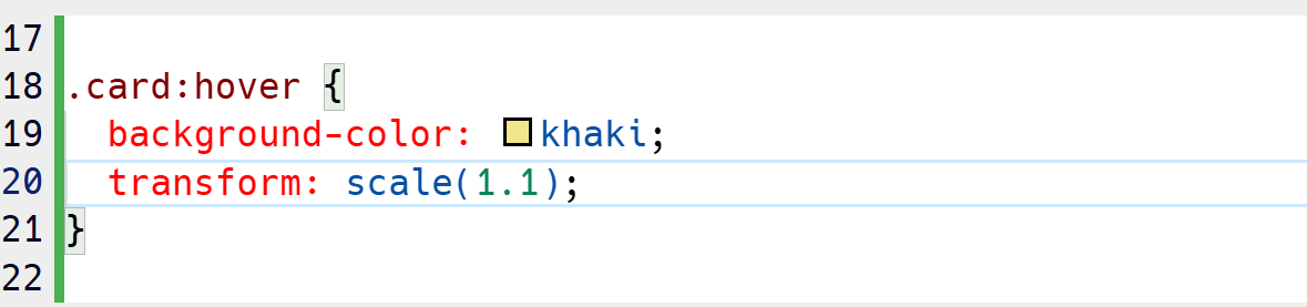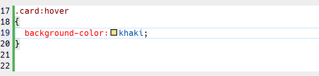 Add a new selector that changes the background-color of the .card element to khaki when it is hovered over.