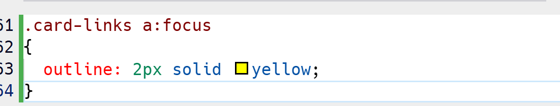 Add a new selector that targets the .card-links a elements when focused. Set the outline property to 2px solid yellow.