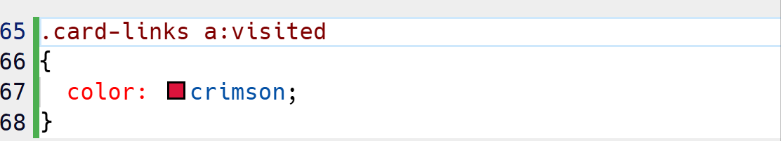Create a new selector that targets the .card-links a elements if they have already been visited. Set the property color to crimson.
