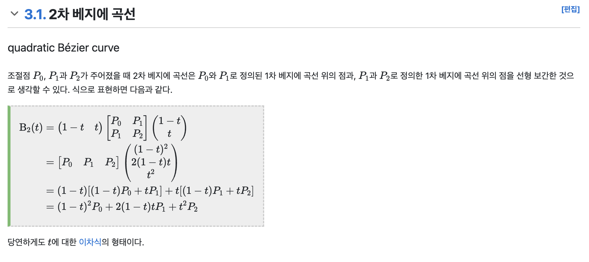 핵심은 시작점 - 중간 보간점, 중간 보간점 - 끝점 에서 2개의 점을 일정 비율로 구해준 뒤