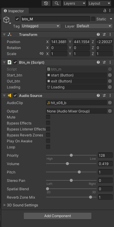 오디오 소스와 오디오 클립을 만들어준다. 지금은 하쿠레이 신사 진입 버튼 효과음을 추가할것이니 클립 명을 적당히 지어준다