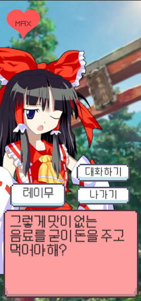 대충 게임이 틀이 잡혀가니 엔딩도 하나쯤 만들어야 할 것 같아서 레이무와 호감도를 MAX까지 쌓으면 엔딩을 볼 수 있게 만들려 한다