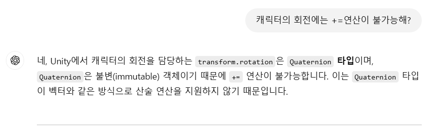 AI의 제안은 대각 이동시 캐릭터를 직접적으로 회전시키는 방법으로 대각 이동시 회전을 주는 방식을 추천하고 있다