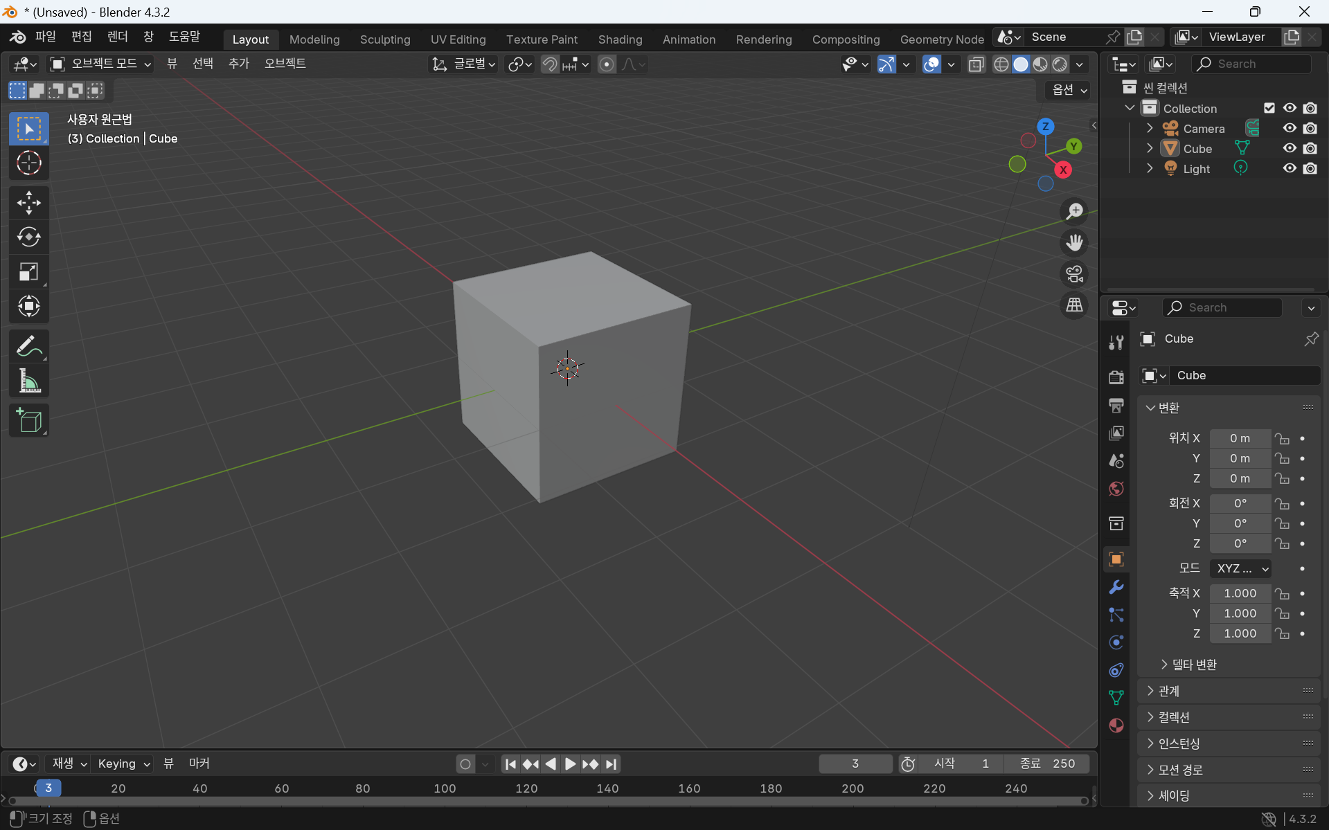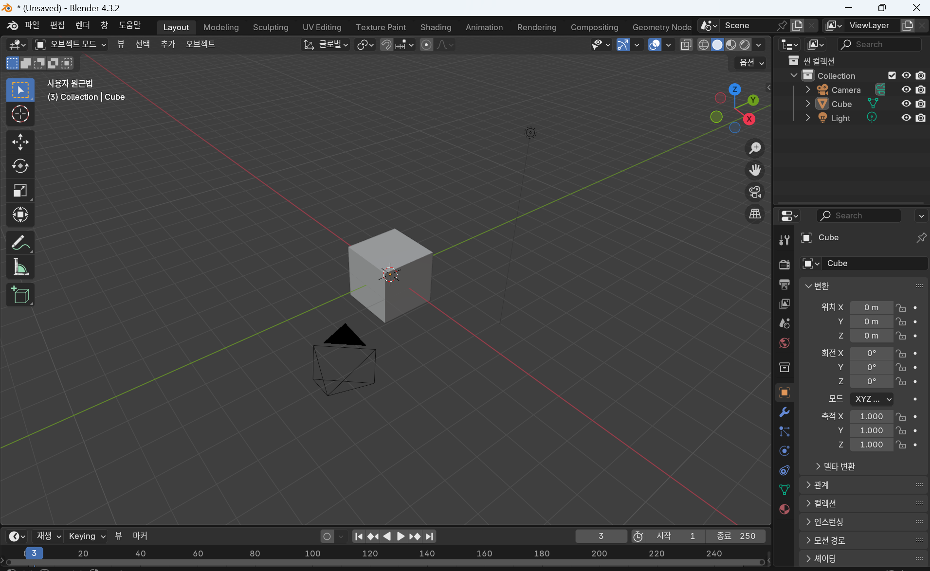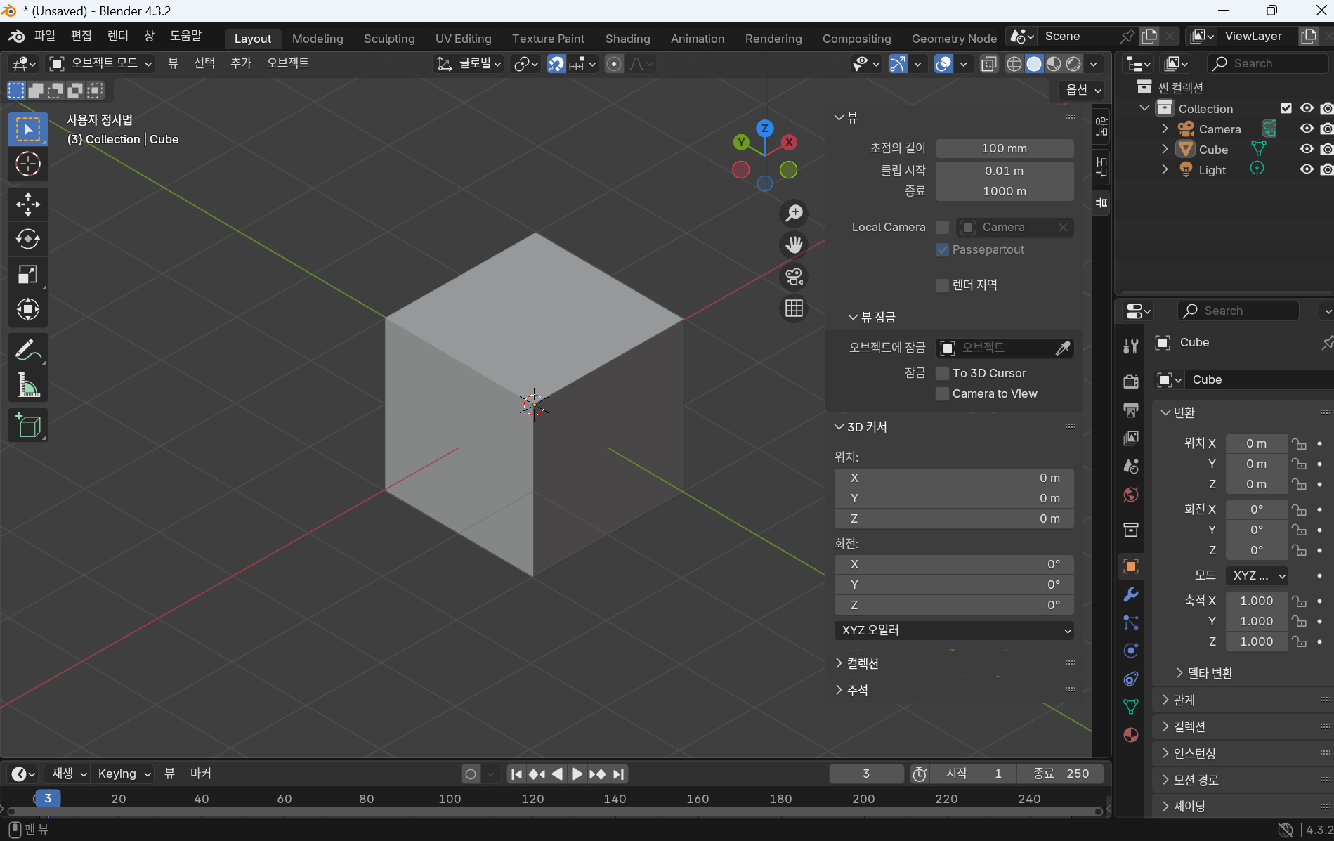 만약 작업중 카메라 위치를 잃었다면 뷰 창의 모든 프레임을 누를시 오브젝트가 있는 위치로 돌아갈 수 있음