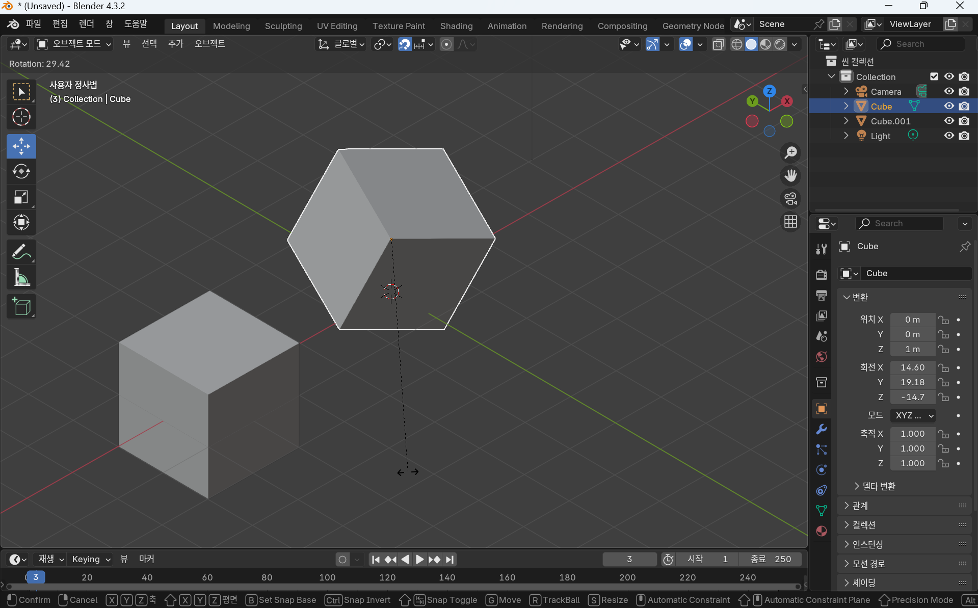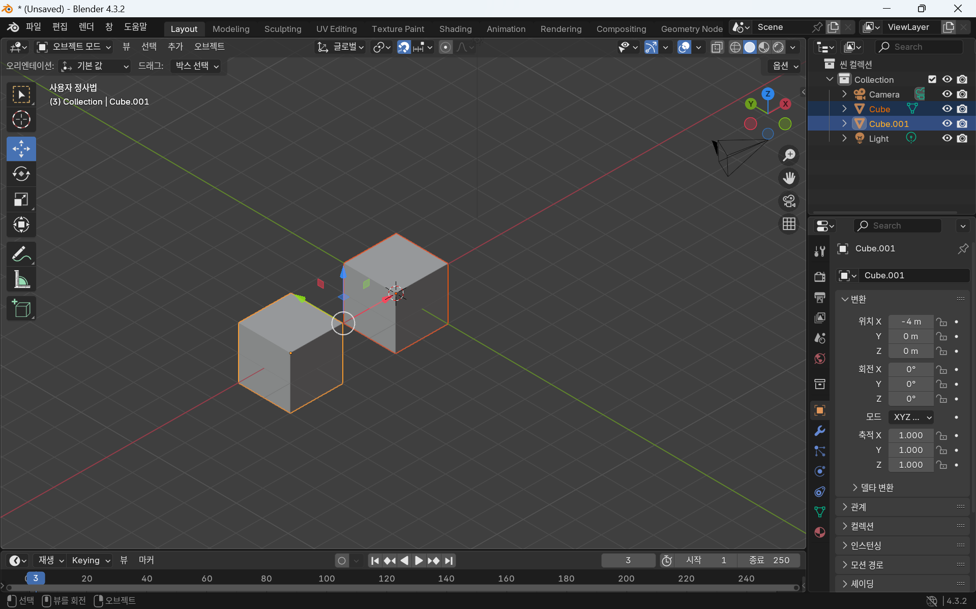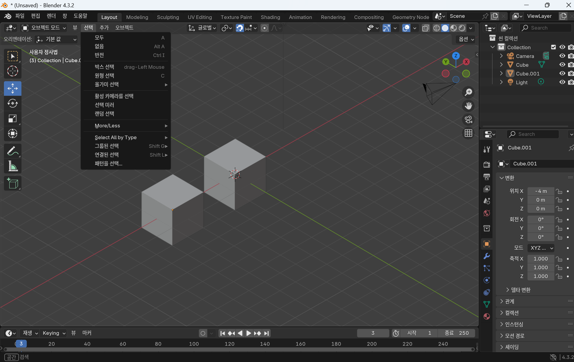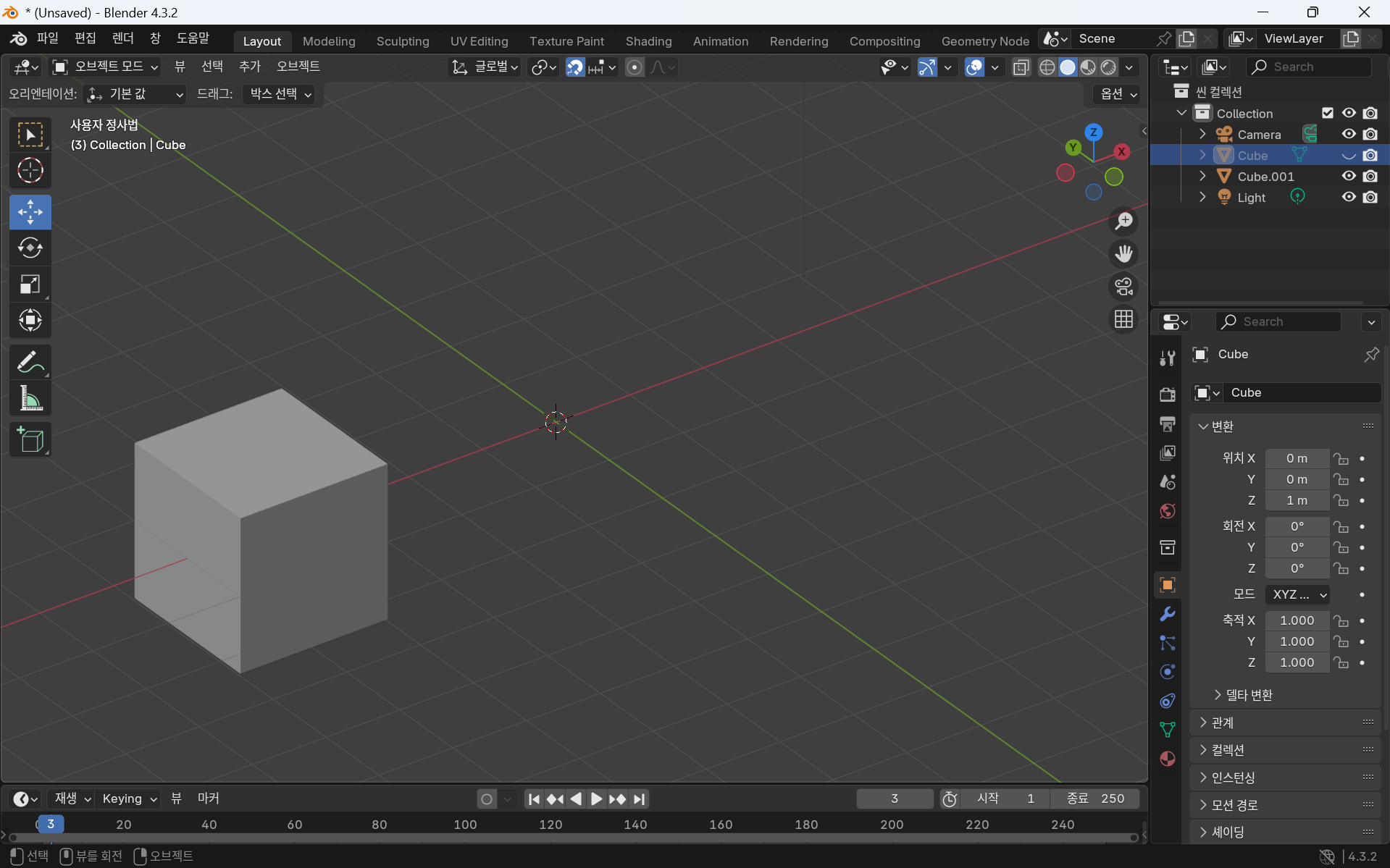 만약 작업중 카메라 위치를 잃었다면 뷰 창의 모든 프레임을 누를시 오브젝트가 있는 위치로 돌아갈 수 있음