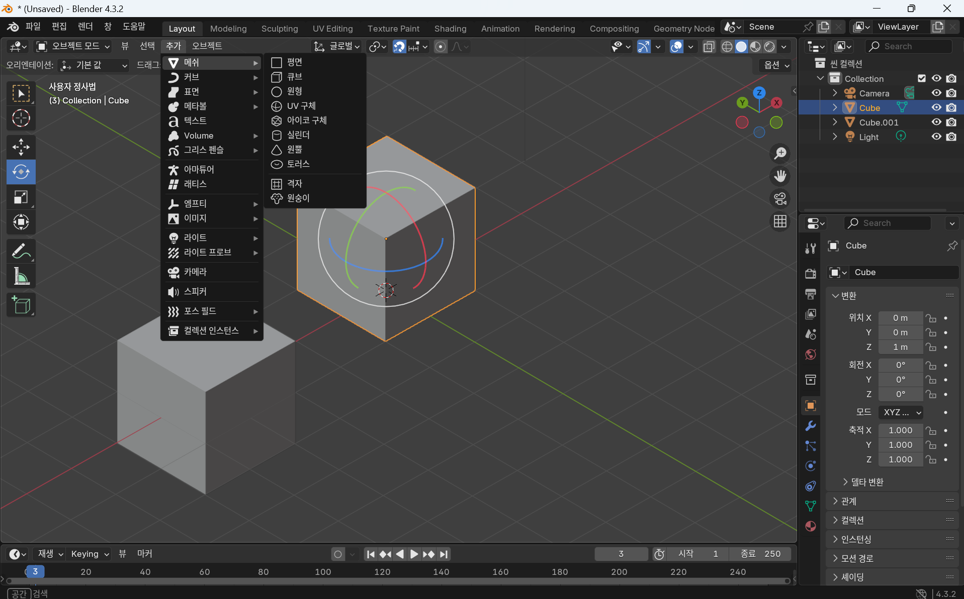 상단의 추가 바를 사용하여 기초 오브젝트를 넣을 수 있음