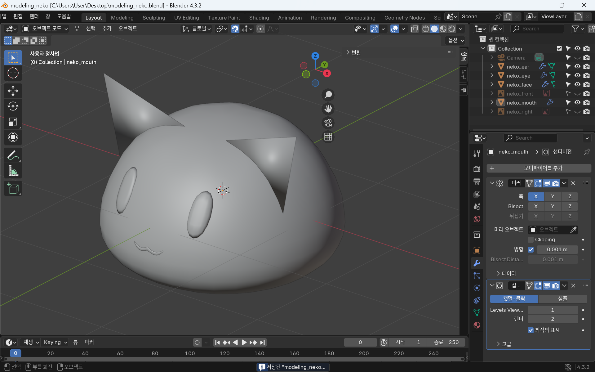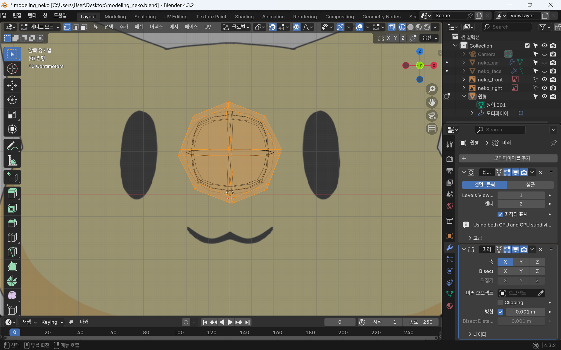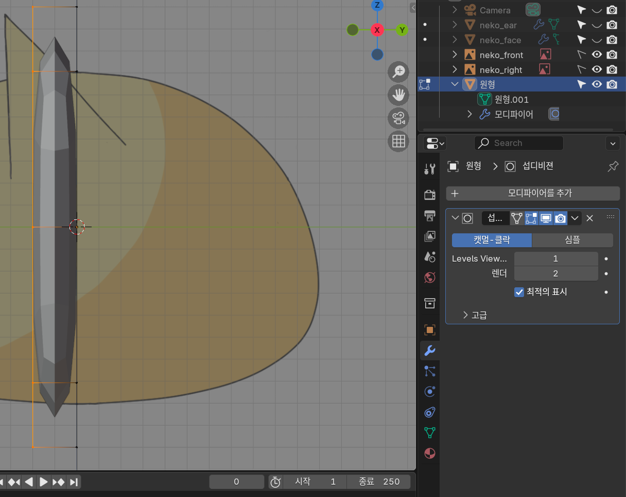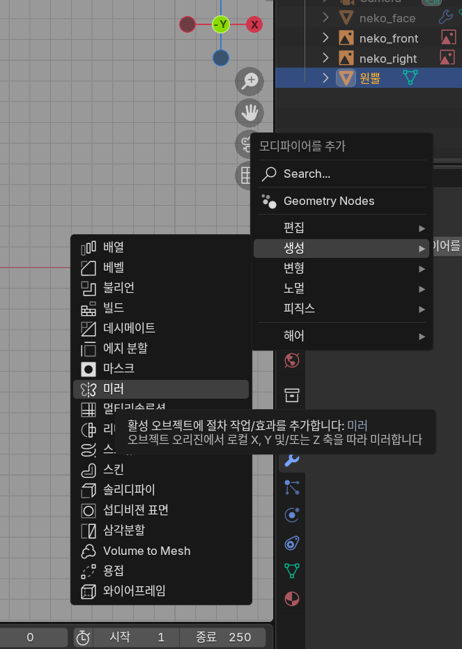 귀는 같은 부분 2개이므로 모디파이어 - 미러를 사용한다