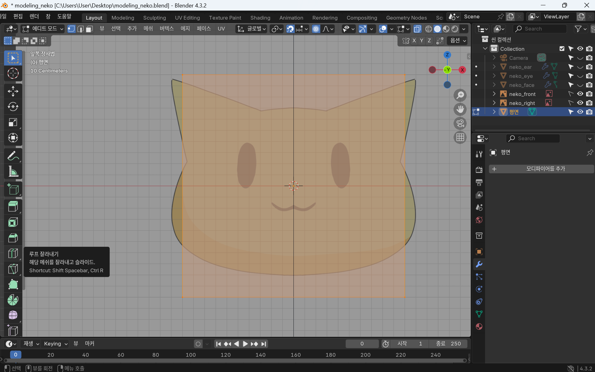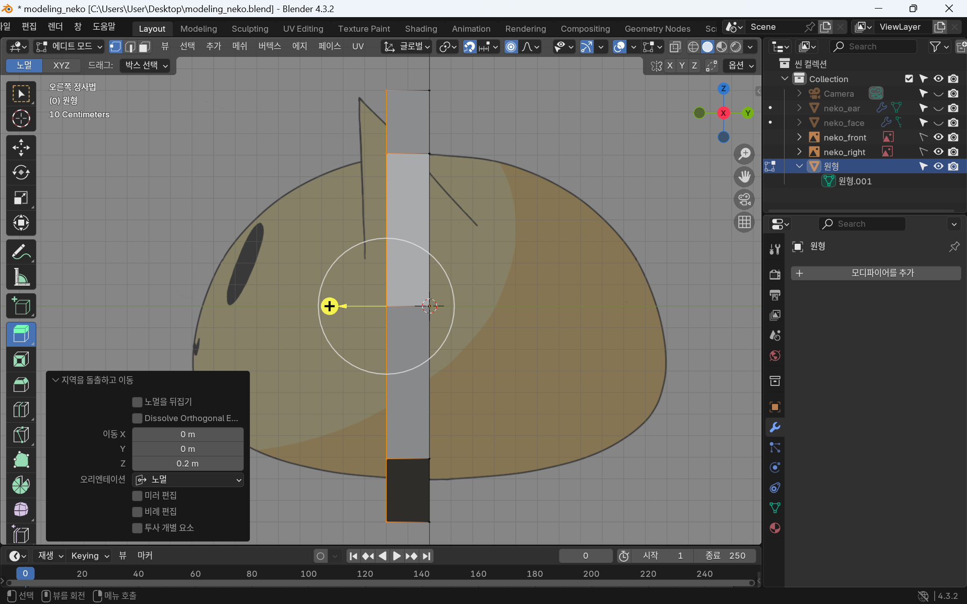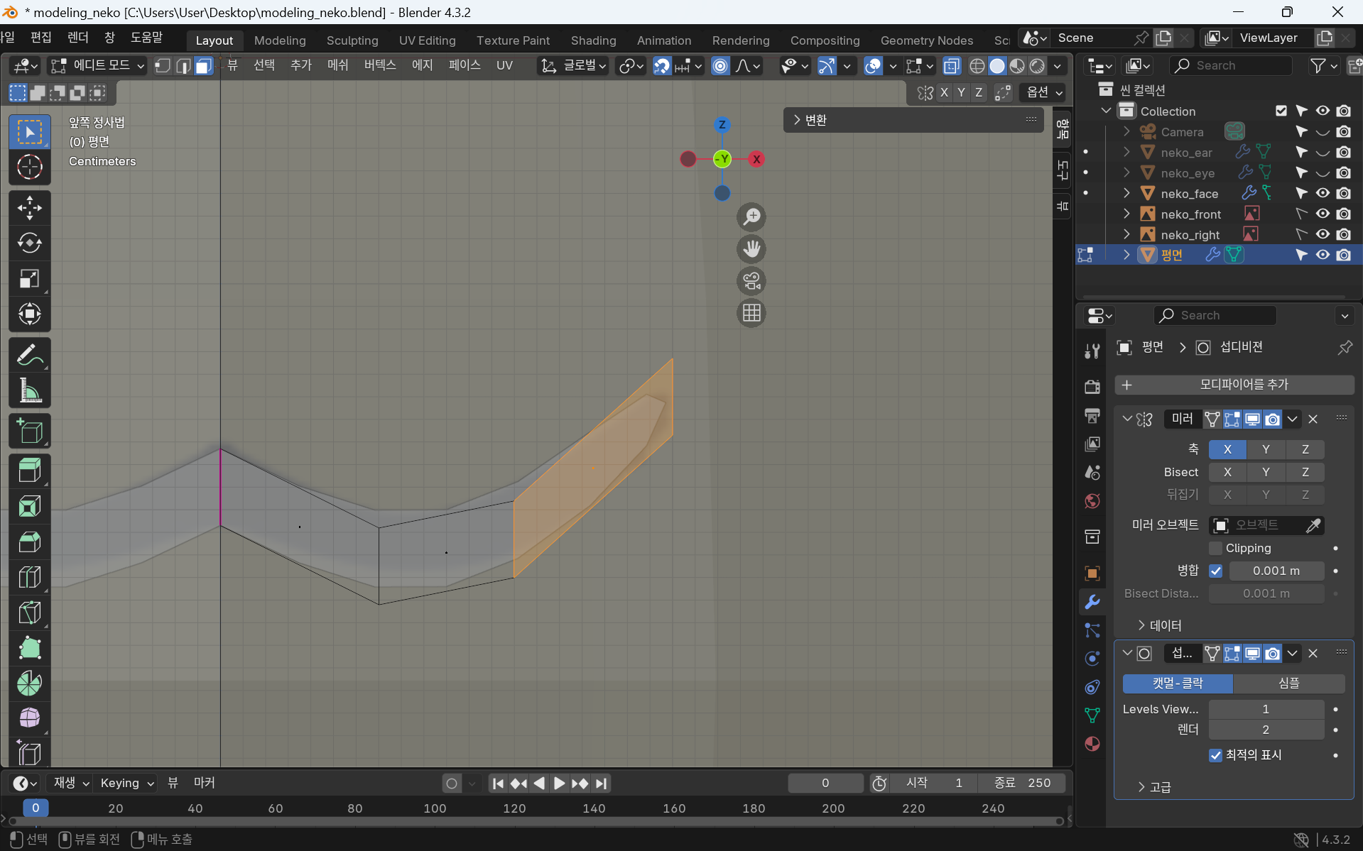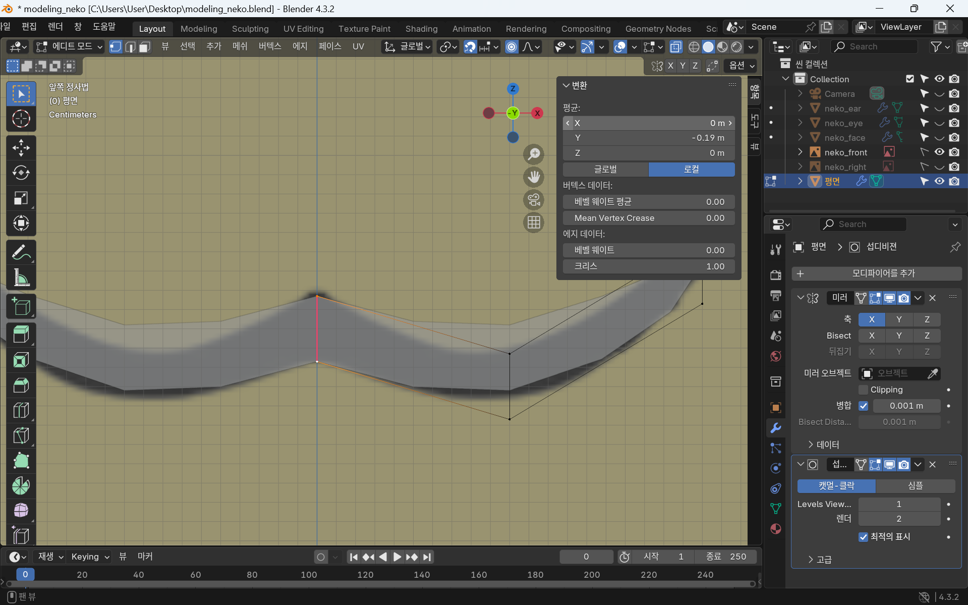 귀는 같은 부분 2개이므로 모디파이어 - 미러를 사용한다