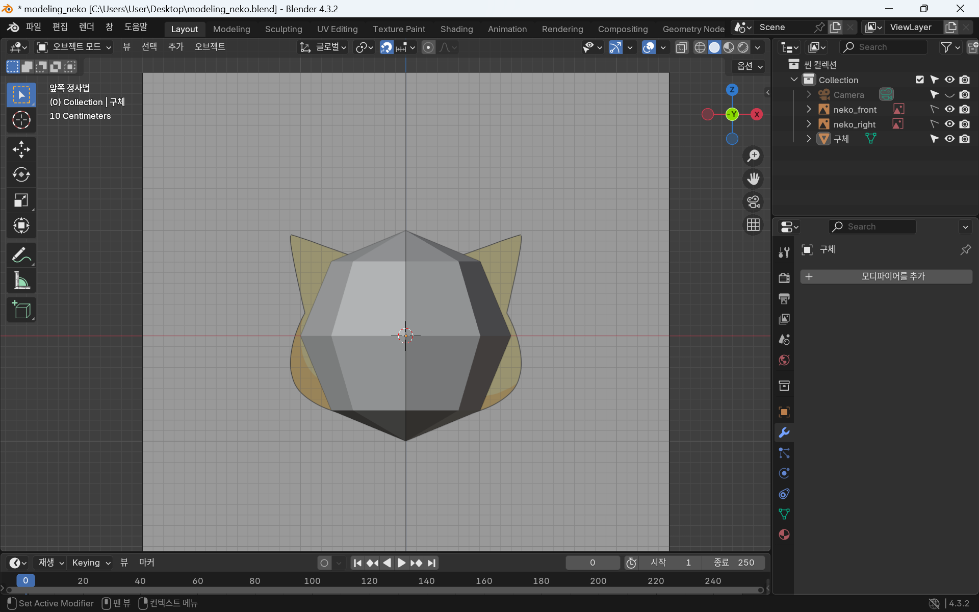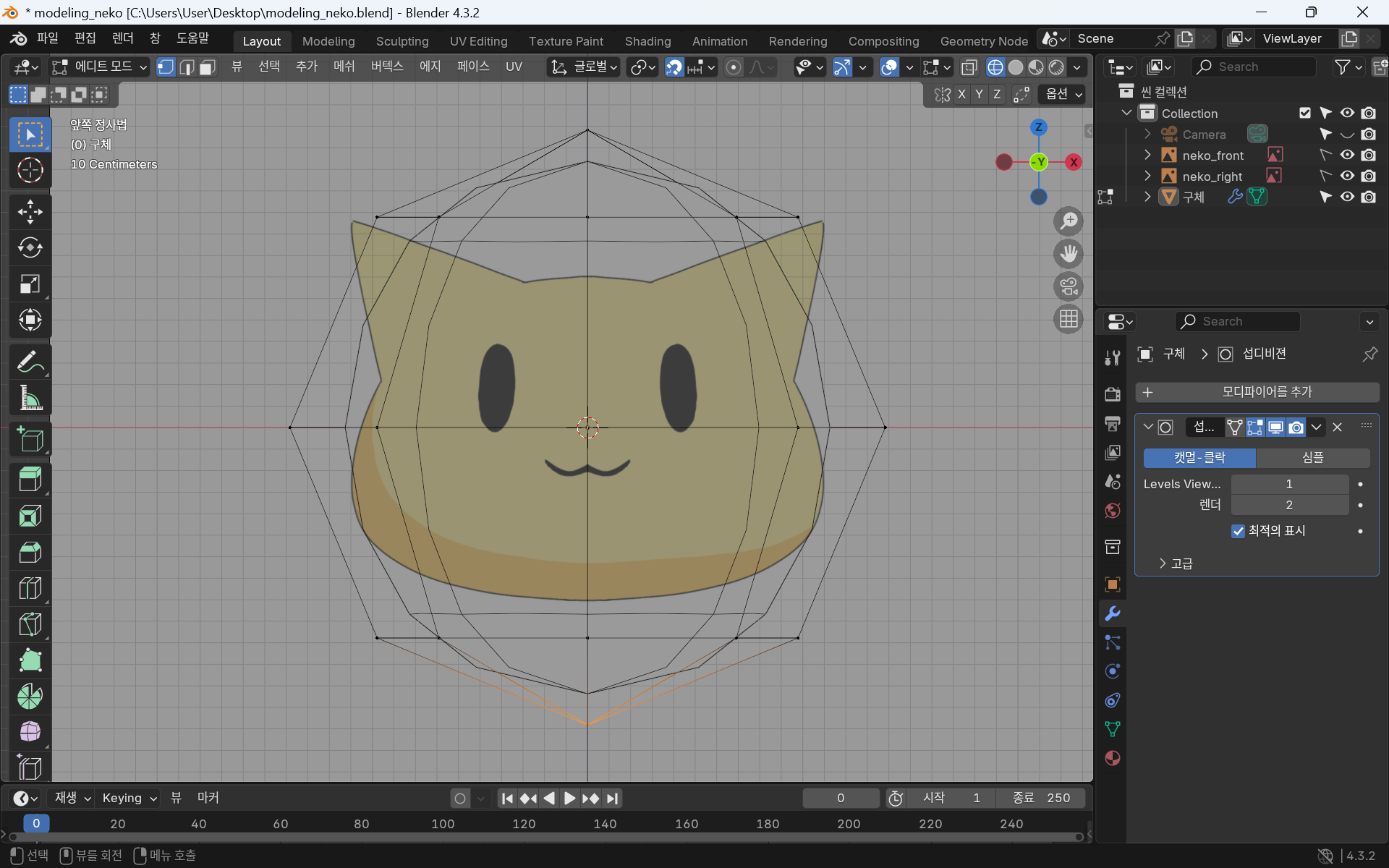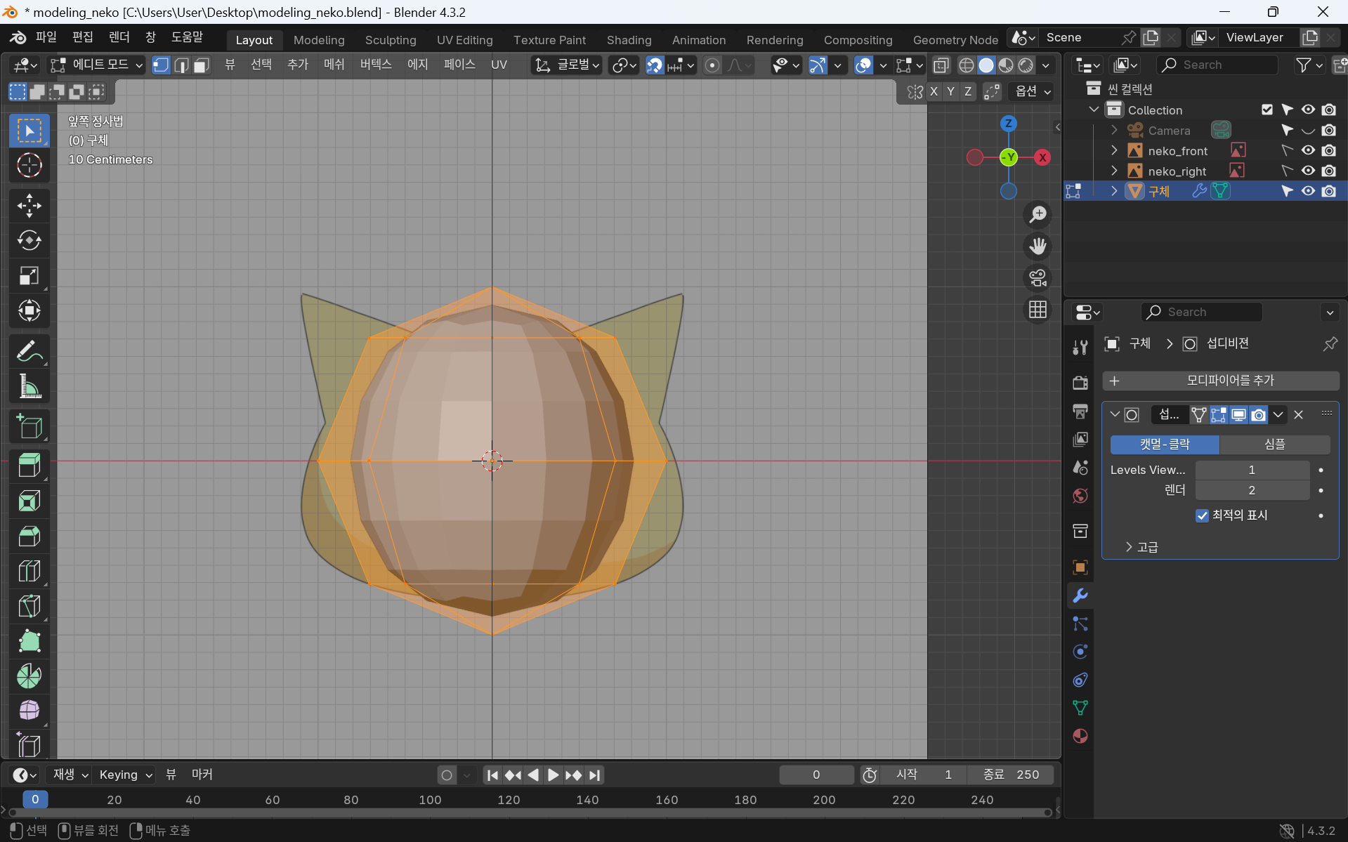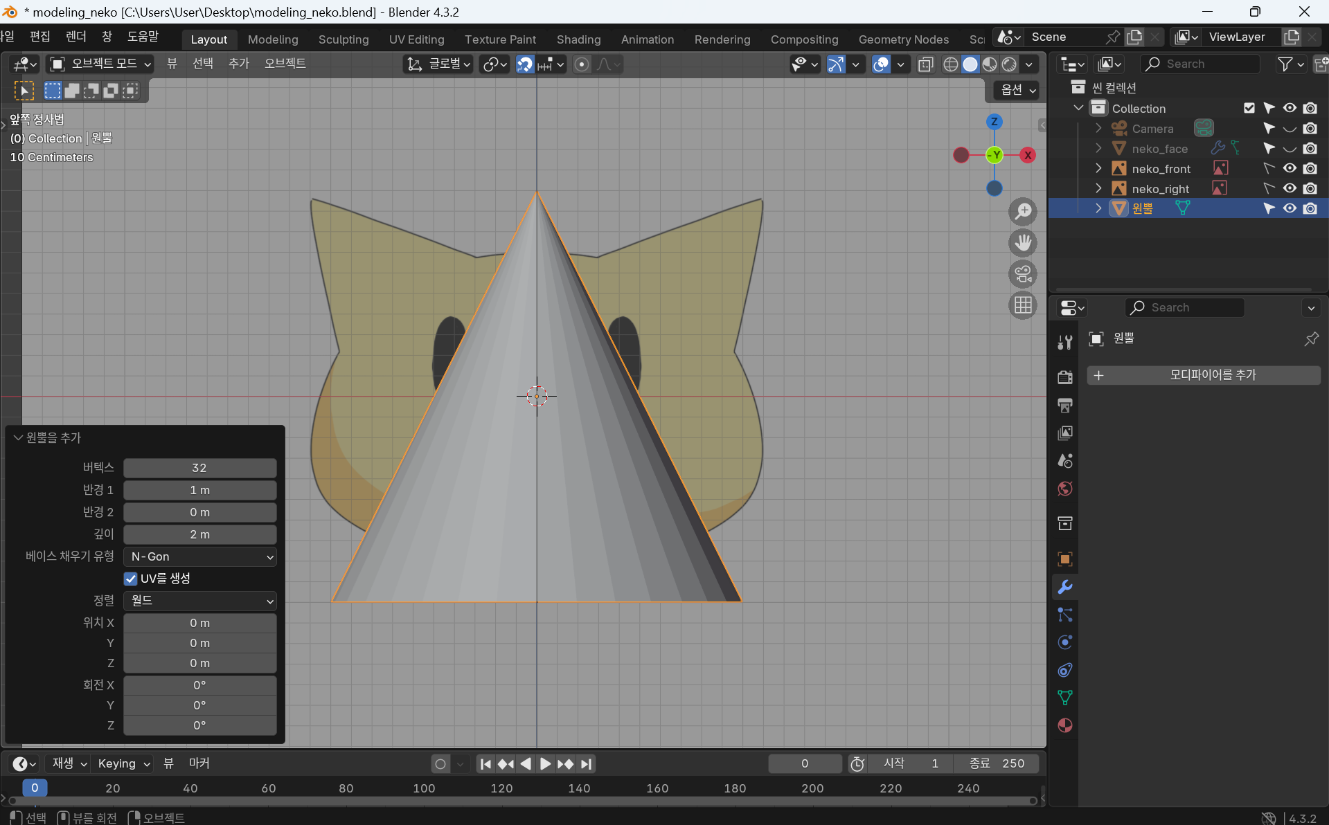 이때까지 한 얼굴 부분은 비활성화 해준 뒤 원뿔로 귀를 만든다