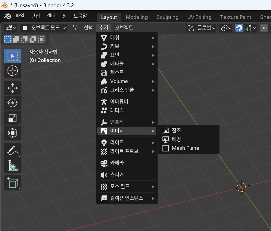 커서를 움직일려면 화면 왼쪽 툴바에서 2번째 항목 = 커서를 선택해서 3D뷰 포트에서 좌클릭