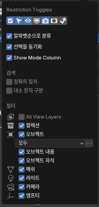 화면 오른쪽 위 아웃라이너에서 필터를 선택하여 restriction toggles에서 두번째 항목을 활성화 함