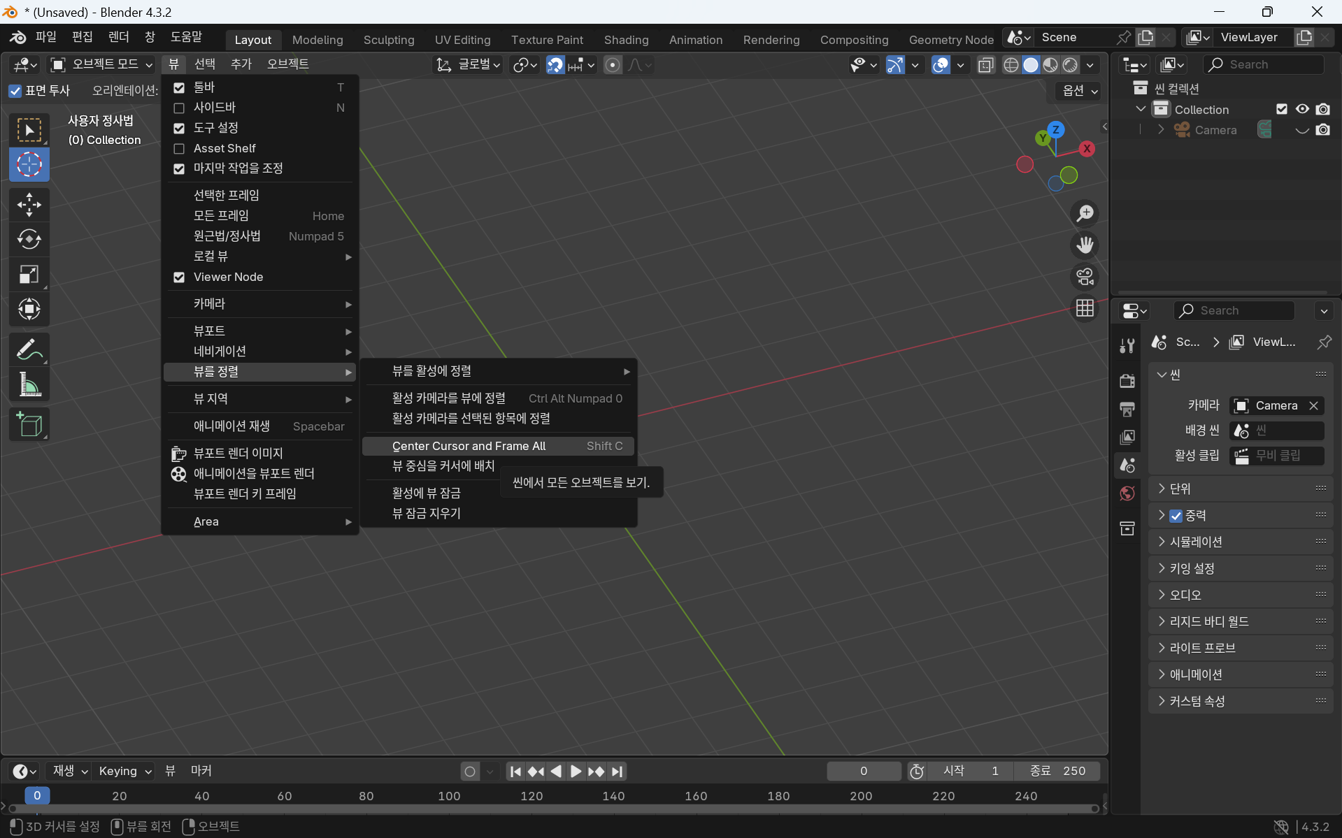 이를 초기화 할라면 뷰 - 뷰 정렬 - Center Cursor and Frame all을 하면 된다